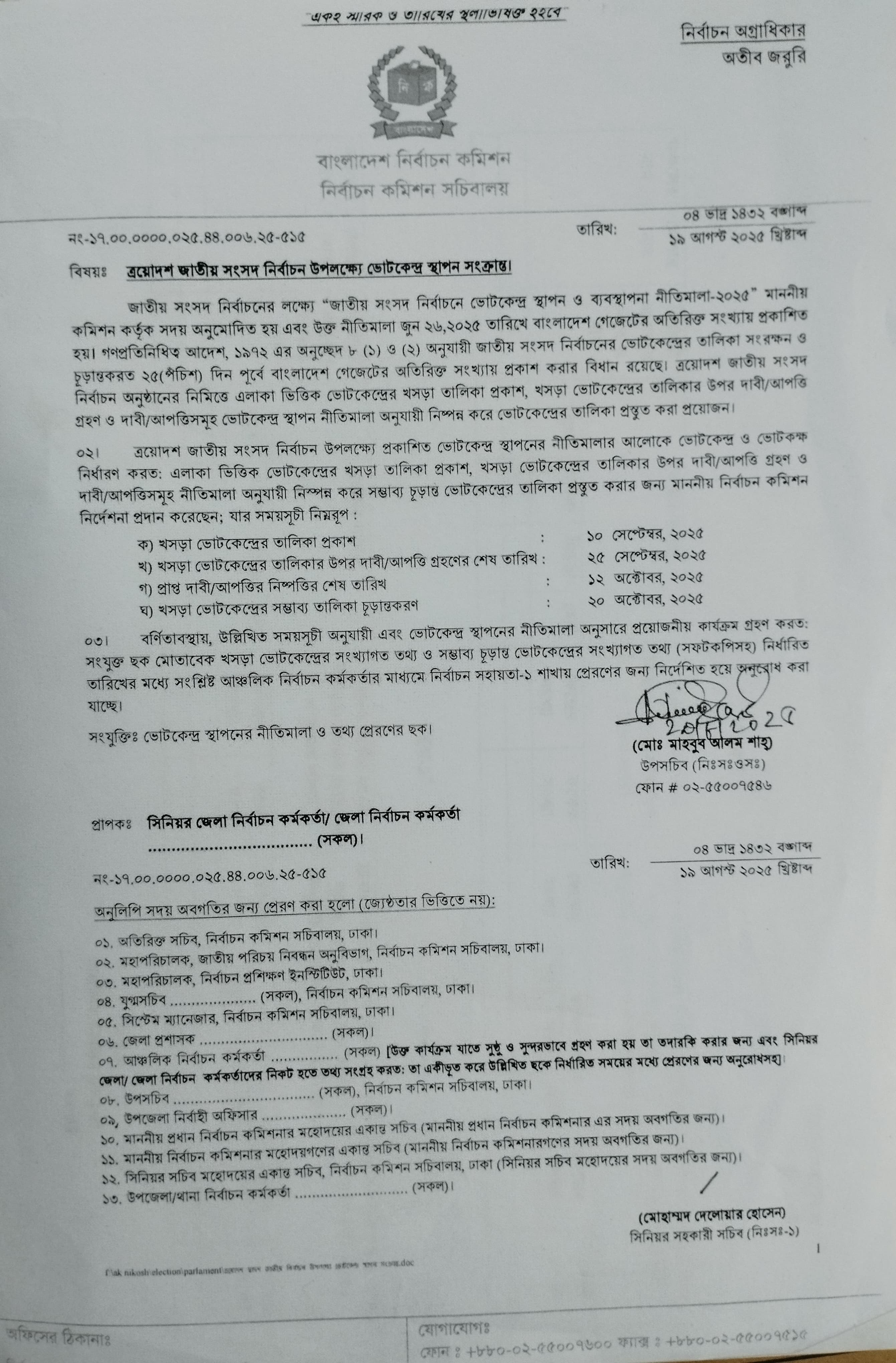 | ৪ | ত্রয়োদশ জাতীয় সংসদ নির্বাচন উপলক্ষে ভোটকেন্দ্র স্থাপন প্রসঙ্গে | | ১৮-০৮-২০২৫ | দেখুন |